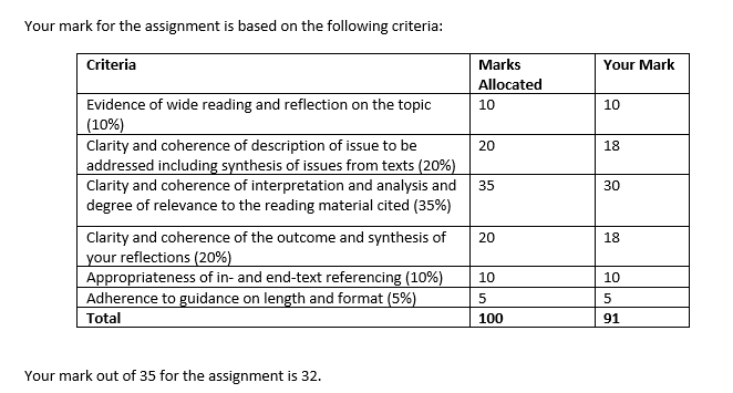 Here is a quick overview of an example of reflective assignment mark sheet and feedback from a lecturer during post-graduation years in Edith Cowan University Western Australia
